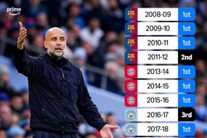 据转播商亚马逊统计,瓜迪奥拉执教生涯至今从未连续两个赛季无缘联赛冠军。