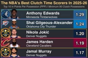 本赛季关键时刻每回合得分top10:华子1.29分第1 哈登第4 KD第8