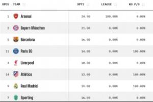 Opta欧冠夺冠概率:阿森纳33%居首,拜仁次席,皇马2.84%跌至第七