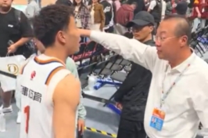 比赛结束后,场边发生了一个小插曲,上海男篮球员李添荣想和场边的球迷击掌互动,但是遭到北京主场工作人员的拦截。