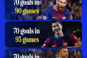 姆巴佩98场解锁欧冠70球第三快,梅西90场解锁70球为历史最快